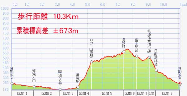 日影沢林道→小仏川遊歩道→清滝駅→リフト→5号路→富士見台→萩原作業道通行止め→隣の尾根→日影沢林道