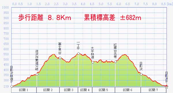 日影沢林道→逆沢作業道→富士見台→一丁平→大平林道→学習の路→北巻路→逆沢作業道→日影沢林道