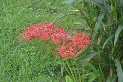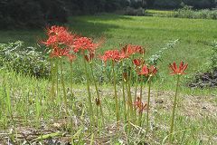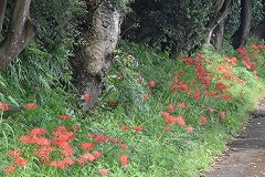 久々の青空、太陽の光を浴び気持ちよく谷戸山歩きが出来る。草木も昨日までの雨で瑞々しく輝いて見える。谷戸山の至る所で緑の背景に真っ赤なヒガンバナが目立つ。今回は同じく写真の趣味のIさん夫妻と同行させて頂く。