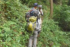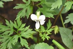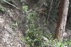 山花友のKさんから咲き始めた連絡が有り、早速天気が良い本日4日南高尾に向かう。途中で一か所花探しの寄り道をしたため何時もより1時間ほど遅れての歩き始めとなる。南側の巻路を行くと大きな倒木が宙吊りとなっている所で登山道を整備しているOさんに追いついて危険な倒木の除去のお手伝いしてから二人で尾根筋の所で昼食にする。