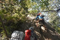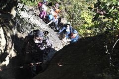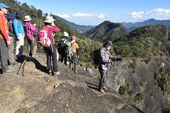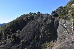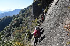 先行の20名ほどのグループが兜岩の鎖場で詰まってしまい15分ほど待機している。岩壁の水平移動や垂直登攀もあり岩登りの楽しさも味わえるがスリルもあり。岩壁にはツメレンゲや岩松がしっかり根着いている。稚児落しの一角の眺めの良い所で遅い昼食にする。