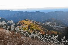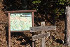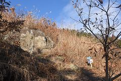 初めは作業道を登って行くと直ぐに作業道と分かれて植林帯の中の山道となる標識もあるので迷う事無く登れる。しばらく登ると正面が明るくなりススキの原に出る。先程分かれた作業道が左から此処まで続いている。ススキ原を右手に見て階段を弧を描くように登って行く。後程の解説でススキの原は丸大の文字が描かれている事が解る。