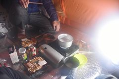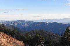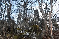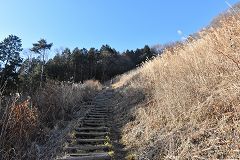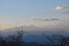 階段を登り詰めると西からの登山道と合流して僅かに急斜面を登ると東西の長い御荷鉾山山頂に出る。直径110mの丸大文字の最上部が山頂で見晴らしも良く南側は武甲山から雲取山の山脈が連なり、北側は雪で真っ白な浅間山が大きく見える。山頂の東西には不動明王の石造が北と南を向いて建っている。沈みゆく陽と共に変化する雄大な景色を眺めてからゆっくり下山する。
