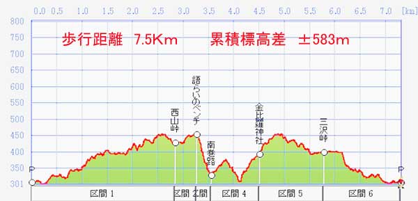 P→西山峠→語らいのベンチ→南巻路→金比羅神宮→三沢峠→P。