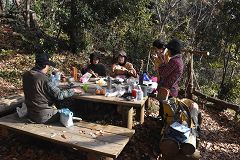 語らいのベンチで昼食、一人の時は食事は質素だが大勢になるとテーブルの上も賑やかになる。生ハム入りトースト、おにぎり、パン、漬物、果物類さらに餅入りお汁粉をWAさんが作ってくれる。何時も重い物を持って来て頂き感謝。