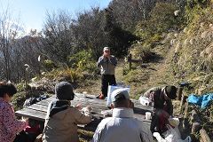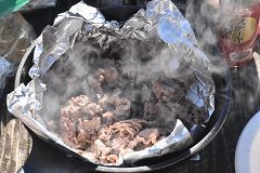 焼肉の香りが一面に漂うので縦走路(メイン道)から離れたテーブルベンチで昼食会を始める。焼肉関係を10人分ほど用意して来た所に、おでんも加わり総勢7名ではとても食べきれず。
