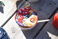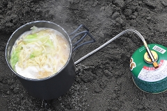 箒杉沢を渡り河原で昼食にする。降りの緊張感も此処ですっかり解けて野菜入りの暖かいインスタントラーメンを綺麗な川の水で茹でて作り食べ体も体内から温まる。予報どうり青空になって来て陽も射して来て震えることなく河原での食事休憩が出来る。