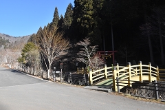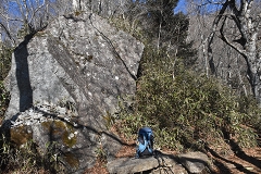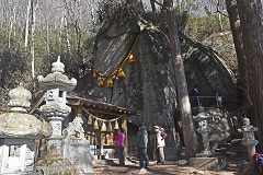 石段を過ぎると登山道は緩やかになり枯れ枝越に富士山も見えてきて苦しさも癒される。右方向に平行移動すると、ご神体の大きな縦に裂けた岩の下に石割神社があり10名ほどの登山者が詣でている。何時もは通過しているが本日は此処で初詣を済ませる。