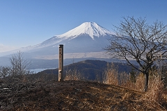 山頂まで120m程の登りだが途中数か所1m程の段差が有る所をロープと木の根を頼りに登る所が有り、幸い霜が溶け始めで泥濘になっていないのは助かる。山頂も日当たりの良い所が溶け始めていたが未だ普通に歩ける。30分ほど富士山を眺めてから富士山を正面に見ながら平尾山に向かう。