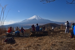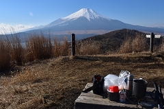 数名の登山者が先行して行ったが平尾山に着くと誰もいないので富士山の展望を一人占めしながら用意して来たラーメン(野菜入り)を作って食べる。寒い時は暖かい食べ物は格別美味しい。(風が出てきてバーナーの炎が不安定で少し時間が要したが)食べ終わる頃になると多くの登山者が登って来る。今回は大平山まで行かず此処から近道を利用して下山する。