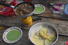 枯れ枝の合間からは雪斑の丹沢山塊が間近に見えるが富士山は全く見えない。西から天気が崩れて来ている様子だ。Kベンチで暖かい野菜入りラーメンと焼肉の豪華な昼食、ホットコーヒと甘味で至福の一時を過ごす。