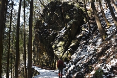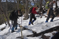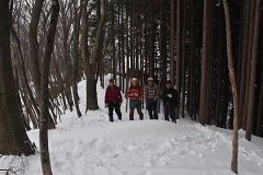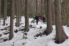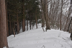 前回は沢筋のルートを辿って行ったが積雪が心配で尾根ルートから登る。前回の苦い経験もあり確実に尾根筋に登るルートを選択して行く(新秩父線61号鉄塔を目指す)ニ十三夜碑の有る地蔵峠を通過して明るい尾根筋に立つ61号鉄塔の開けた所で小休止と軽く昼食を摂る。降って来た単独の方に状況を聴くと途中で雪が深くなり引き返して来たとの事。