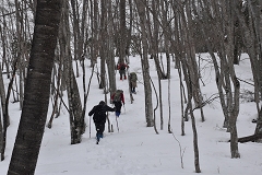 とりあえず大ドッケを目指すが登るにつれて積雪が増してきて空は雪雲が張り出して来て青空から灰色のに変わり雪も横から流れて来るように降ってくる。登り始めの雪はシャーベット状だが此の辺りまで来ると雪質も締まって来て一歩一歩踏締める音が快く響いて来る。