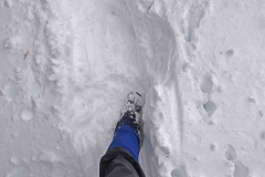1050m付近まで登って来たが積雪が50センチを超えてきて膝も見えなくなりラッセルも無理なのと福寿草も雪に覆われて期待できないので此処から引き返す事にする。福寿草の群生地は残念だが新雪の雪山歩きは十分楽しめる。降りは雪の程よいクッションが有り意外と膝に負担が少なく快適に下れ61号鉄塔で先に下山したOさんと合流。