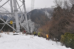 61号鉄塔からは植林帯の中の路で雪も柔らかく所々で地肌も見えてきてスリップに注意しながら確実に足を運ぶ。前回下山したルートには通行止めのロープが有り今回は確実なルートで往路も利用したルートで下山出来る。