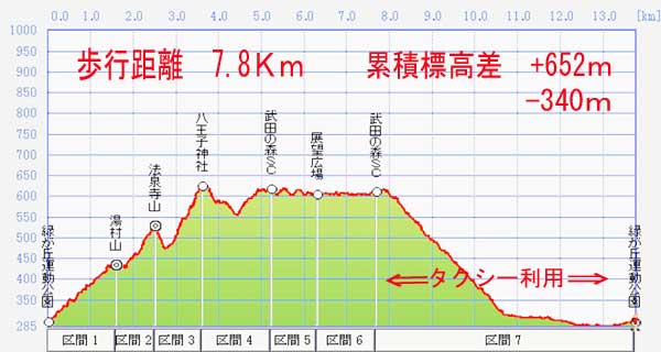 緑が丘運動公園→湯村山→八王子神社→武田の杜⇒緑が丘運動公園