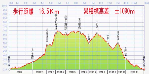日影→小下沢→逆沢林道→景信-堂所稜線→景信山巻路→小仏城山→一丁平→日影