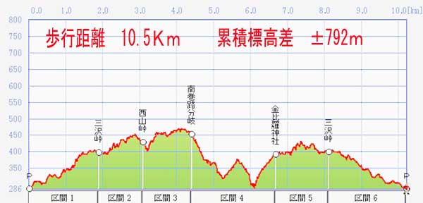 駐車場→三沢峠→西山峠→南巻路分岐→南巻路→金比羅神社→三沢峠→駐車場