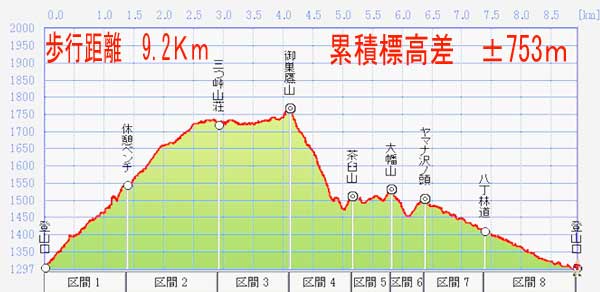 三つ峠登山口→四季楽園→三つ峠山荘→御巣鷹山→茶臼山→大幡山→ヤマナ沢ノ頭→清八林道→三つ峠登山口