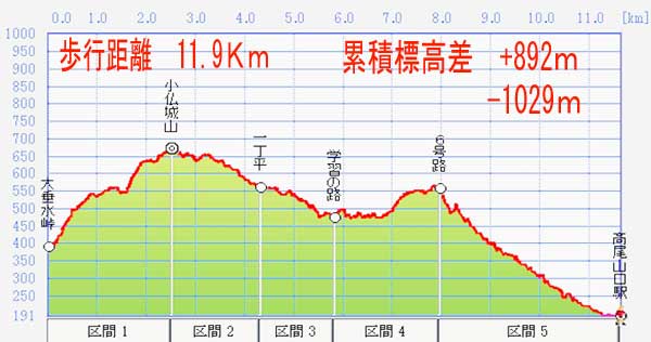 大垂水峠→小仏城山→一丁平→学習の路→紅葉台北巻道→6号路→高尾山口駅