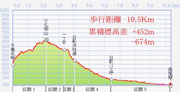 小仏城山山頂でゆっくり昼食を摂った後は一丁平ばで降り、学習の路が通行止の事もあり日影沢に降り、日影沢林道を久しぶりに歩く。沢筋の路は尾根に比べると爽やかな沢風が心地よく感じる。バスを利用せず小仏川遊歩道を下り上椚田橋で北高尾山稜に沈む夕日を眺めてから高尾駅に戻る。