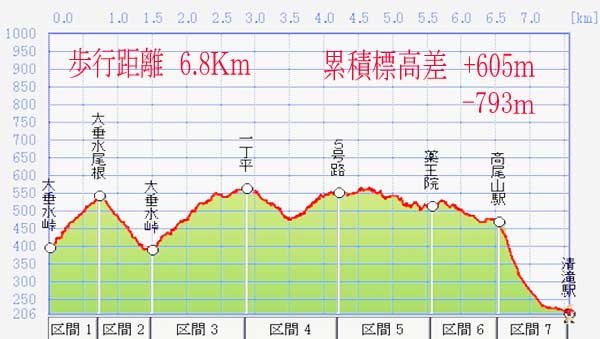 大垂水→一丁平→紅葉台に立巻道→5号路→高尾山駅⇒清滝駅