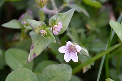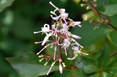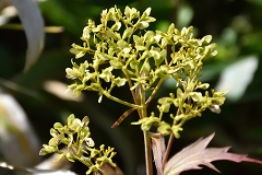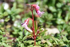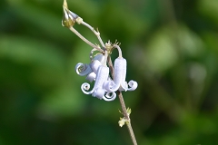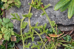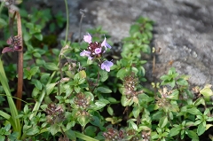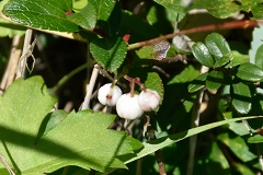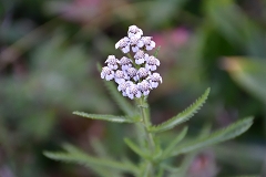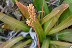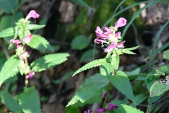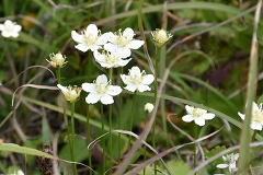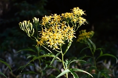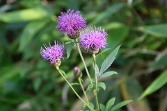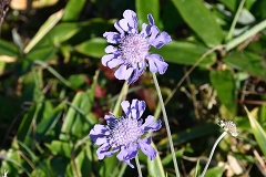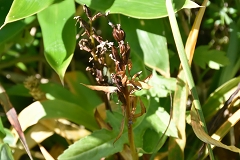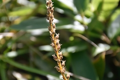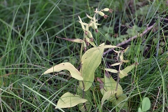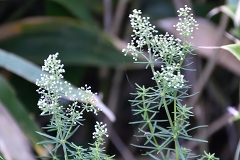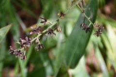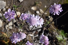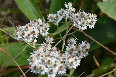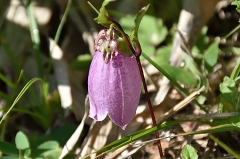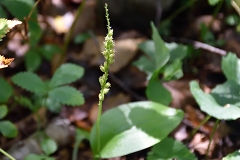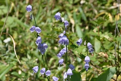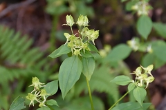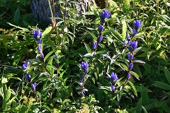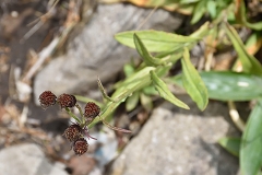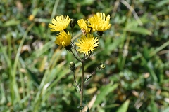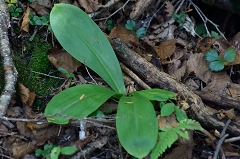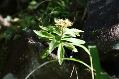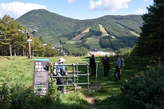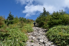 烏帽子岳と湯の丸山のコルまで降り小休止。此処からは湯の丸山山頂まで一直線の登山道で低木と笹原が山頂直下まで続く日当たりの良い登山道の周りにはイワインチン、マツムシソウ、オヤマリンドウ等が見られ林の床で花の終わったホザキイチヨウランも数株見られ苦しさもしばし忘れられる。