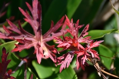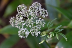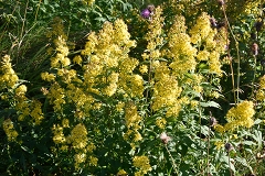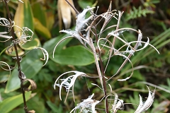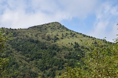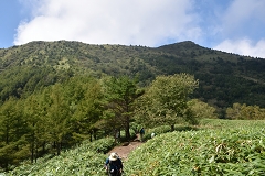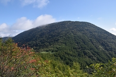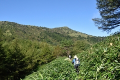 山肌は未だ濃い緑で紅葉はまだ早いが足下には秋の花が多く見られる。昨日に引き続き本日も爽やかな気候で大変気持ちが良く昼寝をしていたい所だが此処から稜線まで急な登りが待って居るので稜線を目指す。稜線までの斜面も笹原が多く笹の合間から秋の花が至る所で見られる。