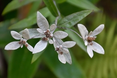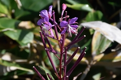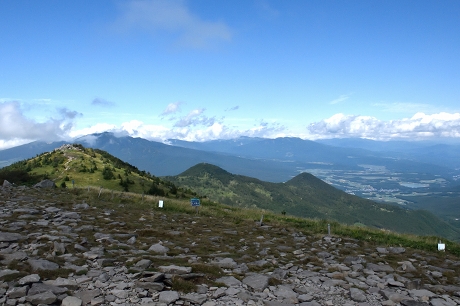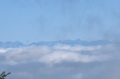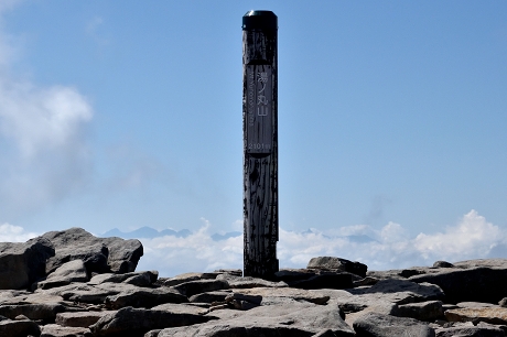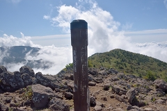 多くの花を見ながら稜線に出ると急に視界が広がり富士山も雲の上に浮んでいる。八ヶ岳、北アルプスの山脈も雲海の上に浮いて見える。予想以上に展望が良いのでしばし景色を楽しむ。右手のピークが山頂と思いこみ登って見ると小烏帽子岳の標識が有る。健脚3名のザックが置いてあり前方の烏帽子岳に既に登っている。