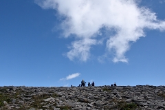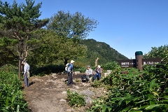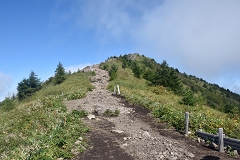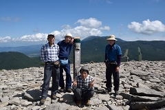後を追い烏帽子岳山頂に到着し全員(5名)で記念写真を撮り、ゆっくりしていたい所だが次の目指す湯の丸山が有るので烏帽子岳と湯の丸山のコルまで往路を引き返す。キャンプ場にいた大学生のグループ、中学生のグループや小学生の団体さんも元気な声で登って来て賑やかな山歩きと変わる。