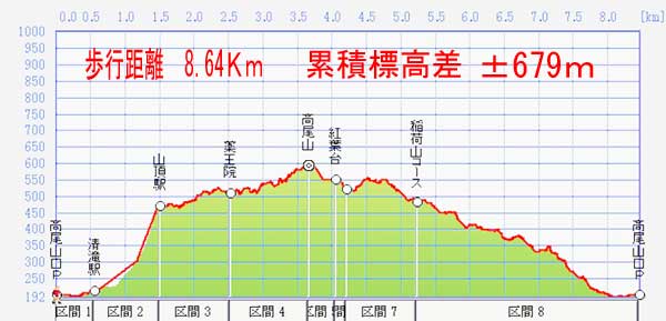 高尾P→清滝駅⇒山頂駅→薬王院→高尾山→紅葉台→富士見台→稲荷山→高尾P