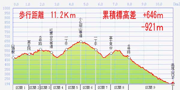 山頂駅→薬王院→5号路→紅葉台北巻道→一丁平→小仏城山→一丁平→大垂富士見台→稲荷山コース→6号路→高尾山口P
