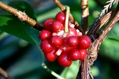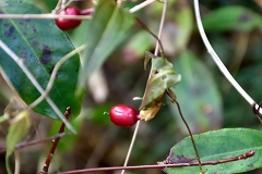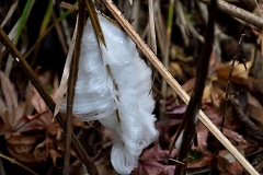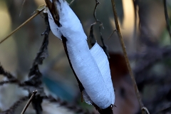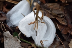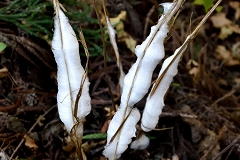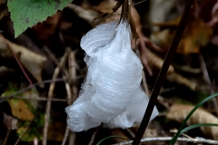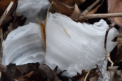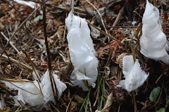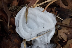 各所の霜の花を見ながら小仏城山迄行くが山頂には上がらず引き返す。居一丁平への降る所で6名ほどのグループがゆっくり歩いているので追い抜こうとすると、なんと花友さん達ではないか。忘年会登山との事でほろ酔い気分で歩いている。5号路の稲荷山コース分岐まで同行する。今日は往路でも久し振りにKさんとも行き交いしばし立ち話。帰路は静かな沢筋の6号路を降りツルギキョウの実など見る事が出来る。