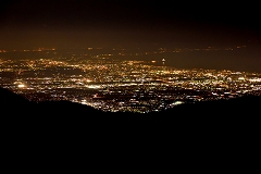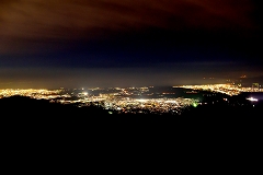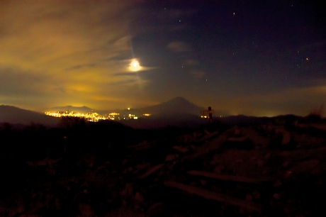 消灯後は外に出て夜景撮影会。夜景、星空、富士山のシルエット感動する景色だがカメラに収めるには難しく三脚なしでは標識の柱の上にカメラを置いて15秒ほど息を止めてのシャッターを切る。今年は気温がマイナスにならず0度ほどで全く雪の無い山頂は暖かくゆっくり撮影もできる。