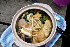 大丸を越えて小丸尾根(通行止め)の分岐を通過する。丹沢、蛭が岳方面は相変わらず雲の中、鍋割山方向は雲の切れ間から富士山も良く見えてきて時折、太陽光も射してくる。鍋割山山頂に着くと多くの登山者が来ていて各所のベンチで鍋焼きうどんを食べている。昼には早いが折角来たので記念に我々も半分ずつ頂く事にする。