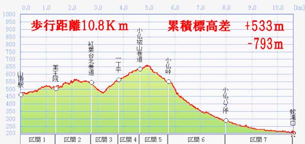 清滝⇒山頂駅→薬王院→冨士道→一丁平→小仏城山巻道→小仏峠→蛇滝口⇒高尾駅