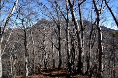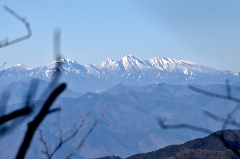 御坂山までの間で一か所富士山が見える所が有ったが反対側の展望は密集した枯れ木で開けた所が無く、夏は葉が生い茂り全く展望は望めない様子だ。枯れ木を透かして八ヶ岳から右手に金峰山、甲武信ヶ岳、大菩薩嶺等が望める。