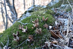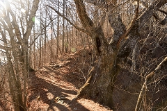 御坂新トンネルが出来る以前も何回か旧トンネルの出口に有る天下茶屋と太宰治の碑(富士には月見草がよく似合う)を見ているが、此処から御坂山に登るのは今回が初めてで未踏の登山道を枯れ枝越の富士山や直ぐ隣の三つ峠等を眺めながら歩く。