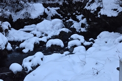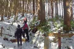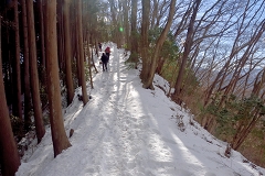 山道に入ると次第に積雪が厚くなり急斜面の登りはスリップに注意して一歩一歩足を進めて行くが緩やかな所ではザク、ザクと足裏からの振動が快く感じる。降雪後の寒波で雪解けが無く降ったままの雪質で表面がサラサラしている。