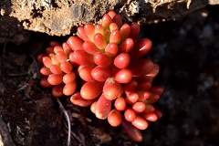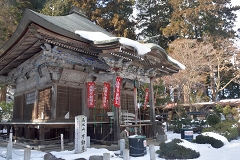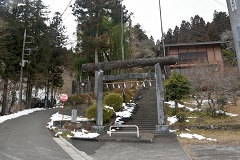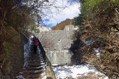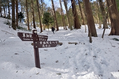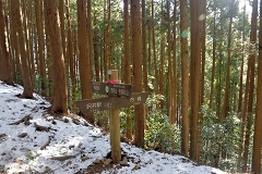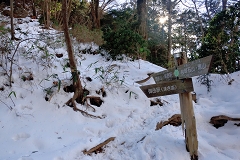 岩茸石山の急な斜面を下り巻路と合流して尾根筋の緩やかな雪道が惣岳山直下まで続く。惣岳山の巻路も有るが直登する。露岩の急斜面で所々で凍っているので両手も使い登り詰め惣岳山山頂の神社の裏に出る。高水山759m、岩茸石山793m、此処、惣岳山756mで高水三山を登った事になりこの後は御嶽駅方面に降って行く。。