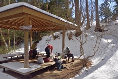 予定では岩茸石山での昼食は出足が遅れてので高水山直下の常福院の休憩舎に変更する。早速準備を始めると肝心の小豆の缶詰が無い。忘れてきた様だ!!幸いお餅は持って来ていたのでお湯で煮て砂糖を振り掛けて黄粉餅の変わりとして食べてが意外と美味しかった。