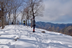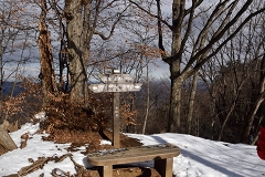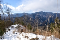 期待して来た暖かいお汁粉は残念だがその他の物で昼食を済ませて3山の一つめの高水山に登る。山頂で一人の登山者と行き交うがその後は全く行き交う人は無し。高水山の急な降りは一部凍っている所が有り慎重に下る。新雪を踏んで気持ちよく尾根筋の道を行き北面が大きく開けた岩茸石山に到着。筑波山、日光方面尾山山、川苔山、大菩薩嶺等の展望が有り。