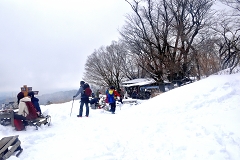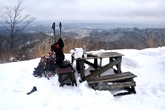 景信山の2件の小屋は営業していて30名ほどの登山者が昼食を摂っている。4年前の大雪の時はテーブルが見えなくなるほど積雪が有ったが今回は深い所で50センチほど積もっている。ホットコーヒーとパンで軽く昼食を摂り此処からスノーシューハイクを始める。