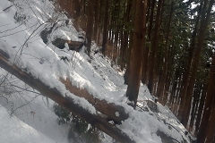 堂所山の急斜面の階段を避けて脇の斜面を降り往路の軌跡を辿り景信山には登らず巻路を利用して行く。今回の雪の重みで倒木が2本登山道を遮っていて乗り越えて通過する。景信山直下のメイン登山道は雪が解けてグシャグシャなので往路のヤゴ沢を降ったが此方も大分雪が解けてシャベット状態となっている。此処でスノーシューを外して軽くなった足で登山口の戻る。