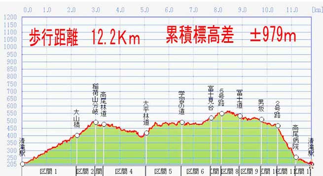 清滝駅→6号路→稲荷山分岐→高尾林道→大平林道→学習の道→富士見台→冨士道→2号路→高尾病院→清滝駅。