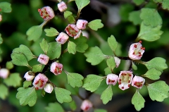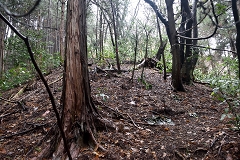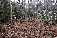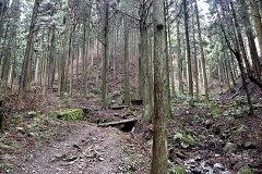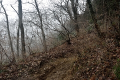 薄い踏み跡がほぼ一直線に続く急斜面を登って行く。昨日の雨で踏み跡は地面が踏み固められてスリップしやすいので脇の落ち葉が重なっている柔らかい所をジグザグに登って行く。左側は植林帯で暗いが右側は自然林で明るく林の床にイチヤクソウ、ツルリンドウ等が各所で見られる。小仏峠からの登山道に出て景信山で軽く昼食にして天候の回復を待ったが陽光を浴びる事が出来ず。