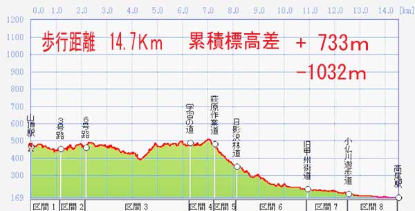 清滝⇒山頂駅→3号路→6号路→高尾林道→大平林道→学習の道→萩原作業道→日影林道→小仏川遊歩道⇒高尾駅