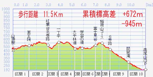 山頂駅→薬王院→紅葉台北巻路→一丁平→学習の道→紅葉台南路→稲荷山コース→6号路→高尾山口駅P