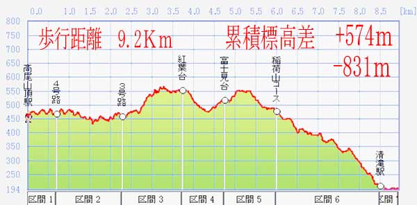 高尾山頂駅→4号路→3号路→紅葉台→富士見台→5号路→稲荷山コース→清滝駅