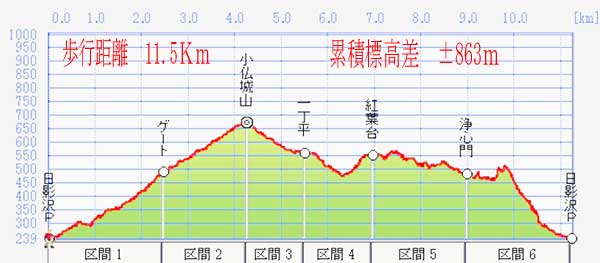 日影林道入口→小仏城山→一丁平→紅葉台→5号路→薬王院→浄心門→4号路→いろはのもり→日影林道入口